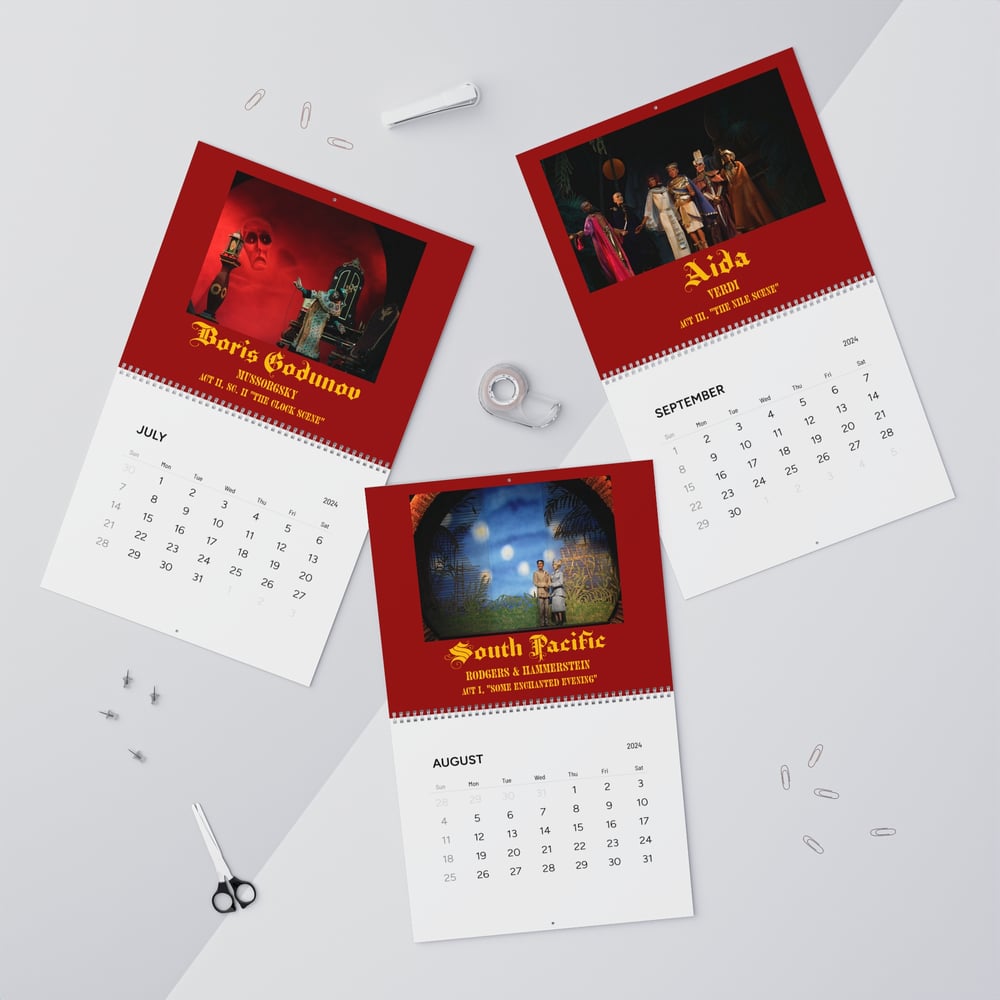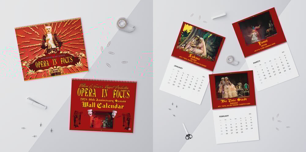 Mark your days in Operatic style with one of these 14" x 11.5" 66th Anniversary Puppet Opera 2024 wall calendars! Printed on ultra high quality paper stock, each calendar is spiral-bound and features vibrant, full-color photographs from some of the most beloved productions we've built over the past 66 years.