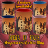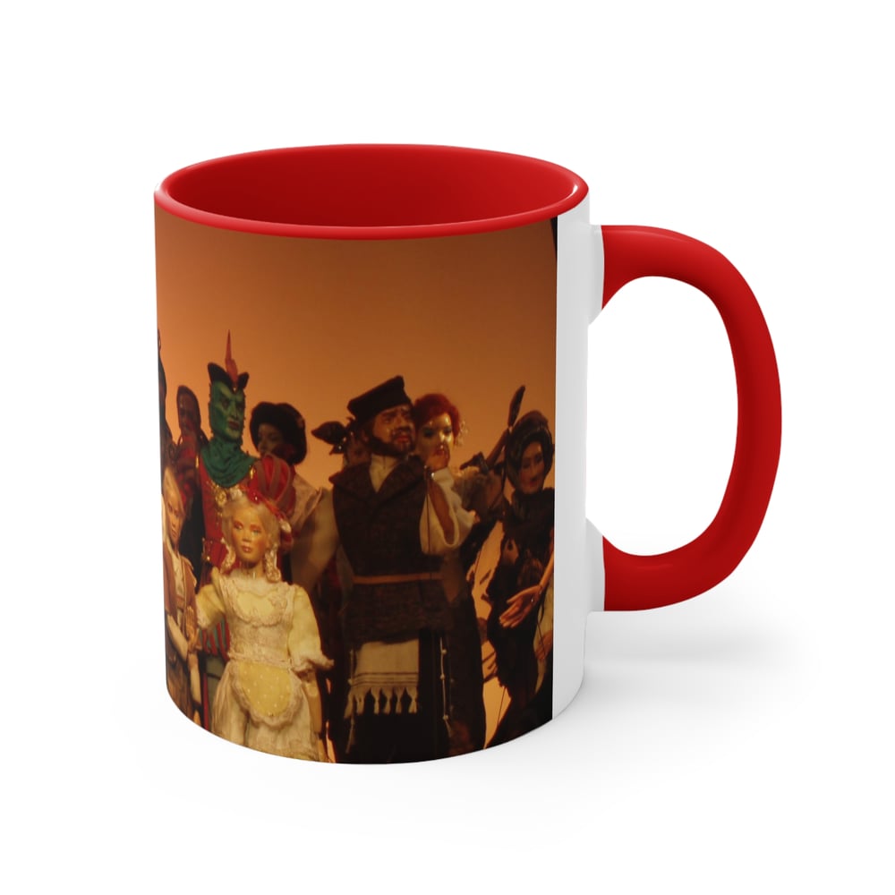 These unique 11oz two-tone coffee mugs are the perfect way to add a little operatic flair to your morning cup of coffee or tea. Made of high quality ceramic, these mugs feature many of the most beloved puppets from our repertoire assembled on stage together including Canio (Pagliacci), Hansel & Gretel, Mephistopheles (Faust), Cio-Cio San (Madama Butterfly), Lakme, and many more!